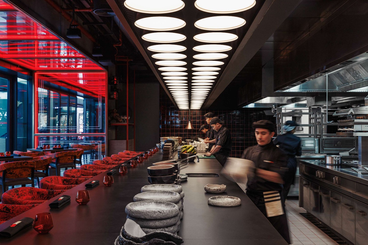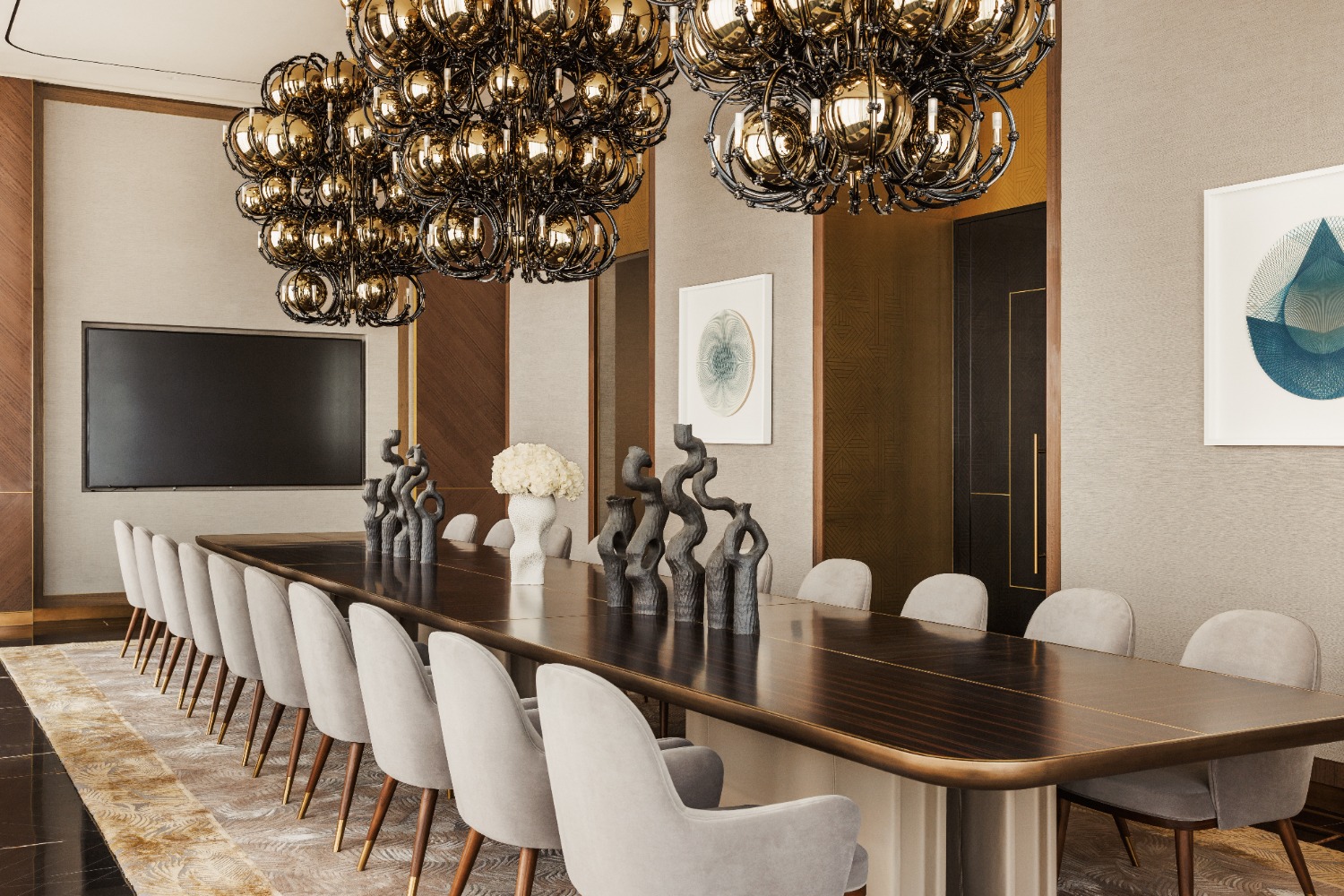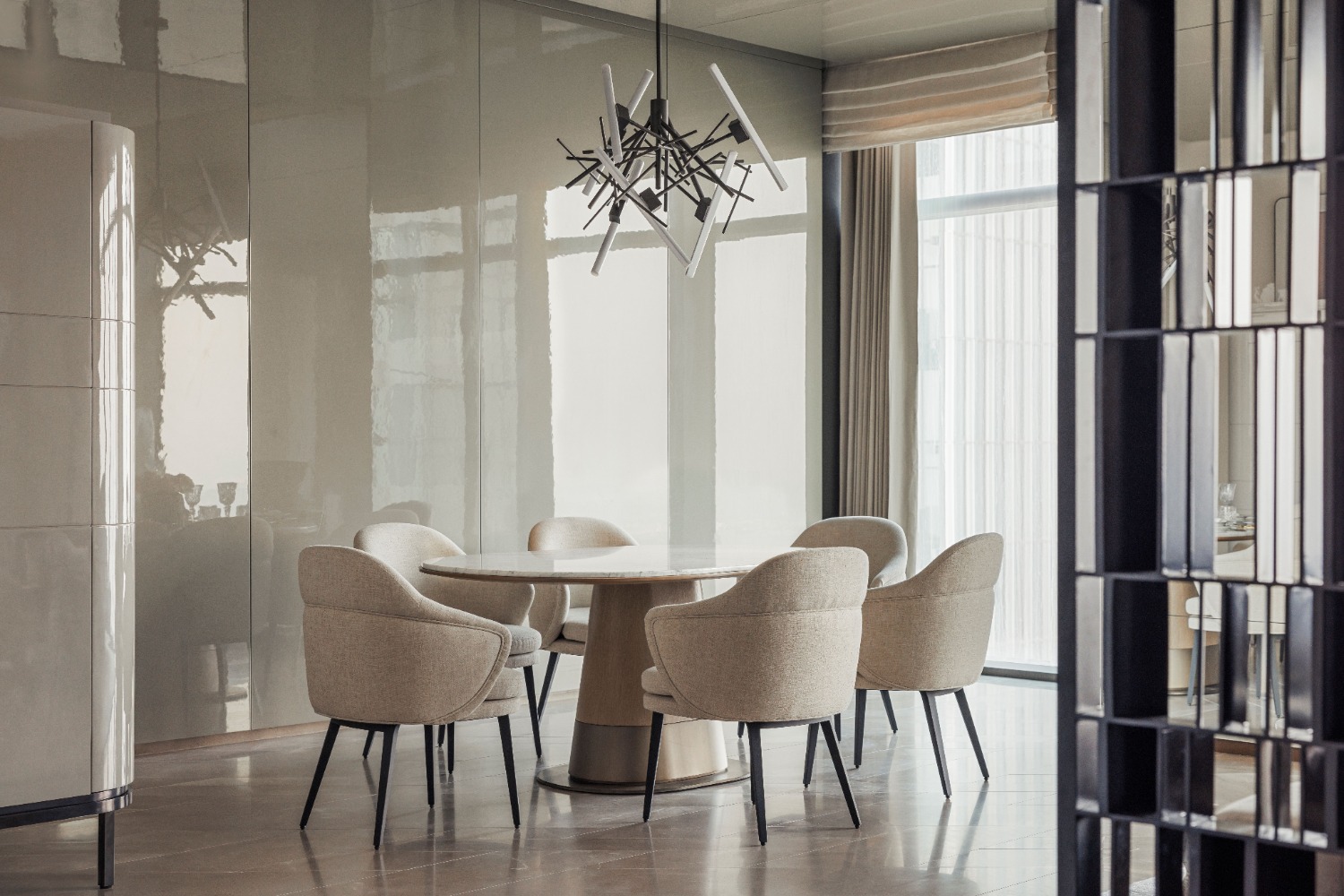 In the main lobby, a monumental suspended lighting installation occupies the central ceiling space. Defined by a minimalist geometric composition, the fixture is formed by intersecting and interwoven slender metal elements, giving it a sculptural, art-like presence. In banquet halls and conference rooms, the lighting adopts a more understated yet luxurious approach. Clean, decisive lines are paired with graduated light intensity, producing soft, non-intrusive illumination that enhances the atmosphere without visual harshness.