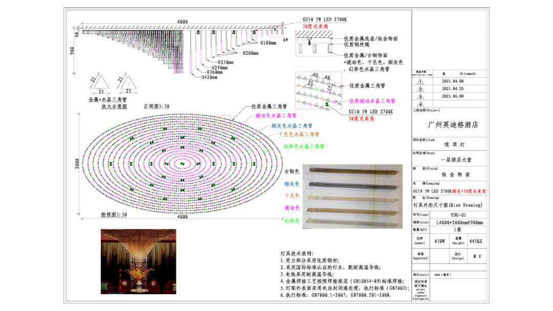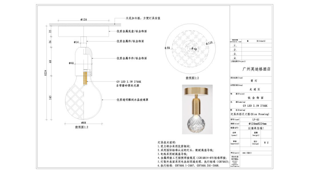 Subtraction is done in the already complicated decoration of the space. The material is made of high-quality titanium gold decoration and glass fiber reinforced plastic arc cover, etc., The surface treatment is Japanese, and the colors are retro and rich in Lingnan style, and the light and shape are used to make a sunny pen.