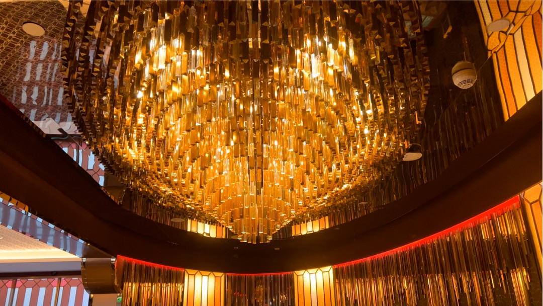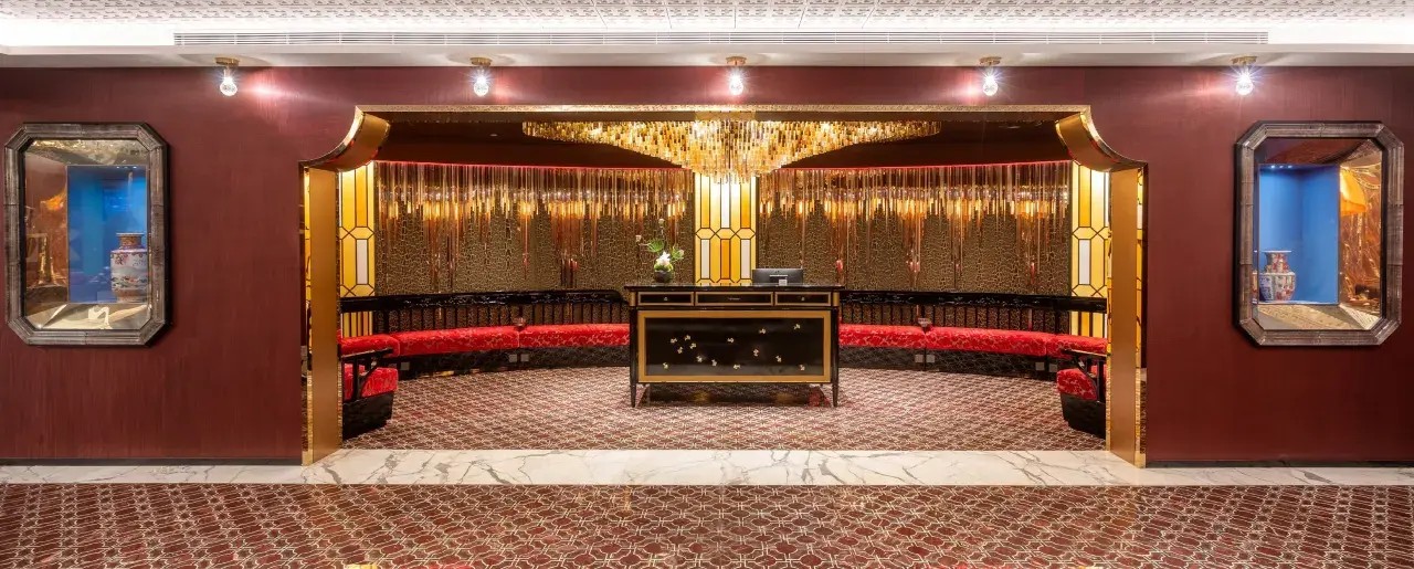 So in this space, we deepened the design of the ceiling lamp at the reception desk in line with the space needs of the hotel. In the end, we used 2,108 amber crystal triangle tubes with a 2700K/30° light source to create this glass-like custom chandelier through crystal refraction. When the guests sit here and rest, they feel like they are in the Dongshan Mansion in the 1920s and 1930s. The warm light color and retro furniture are carved with Lingnan time exclusive to Indigo.