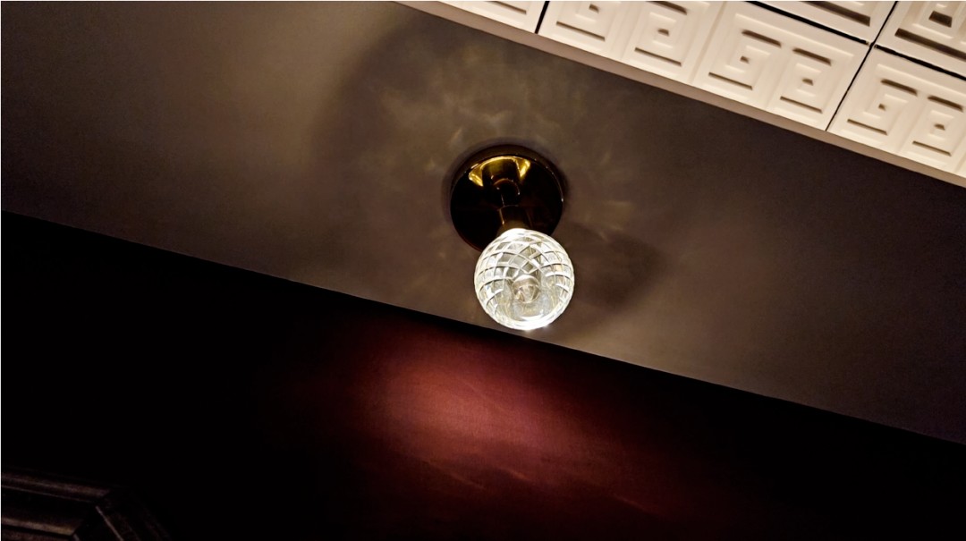 The corridor is the visual dividing line between the front desk and the service desk. There are highlights on the left and right. We use the bulb-shaped design of the crystal glass cover to provide flood light for the space in a small and exquisite manner, and it is integrated into the retro brilliance of the entire lobby, realizing that the entire space does not need commercial lighting. Use decorative lights themselves to complete the final step of light art and function.